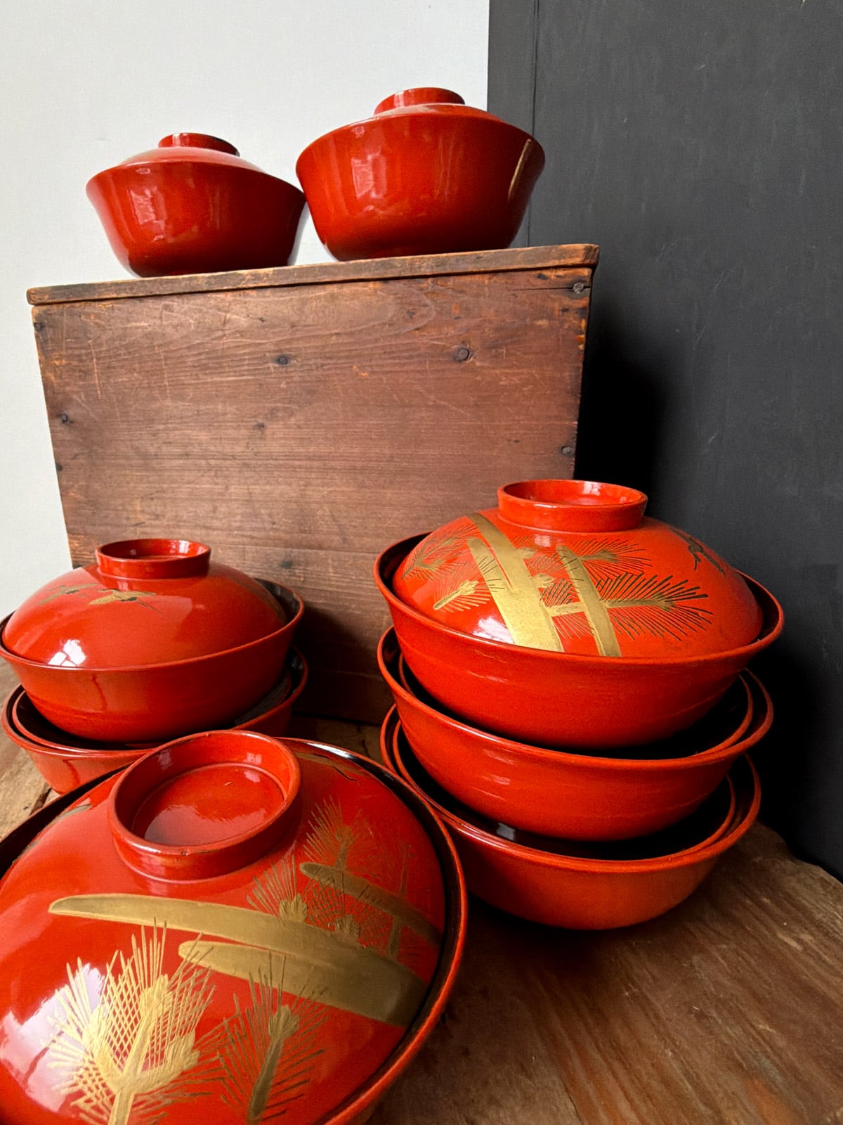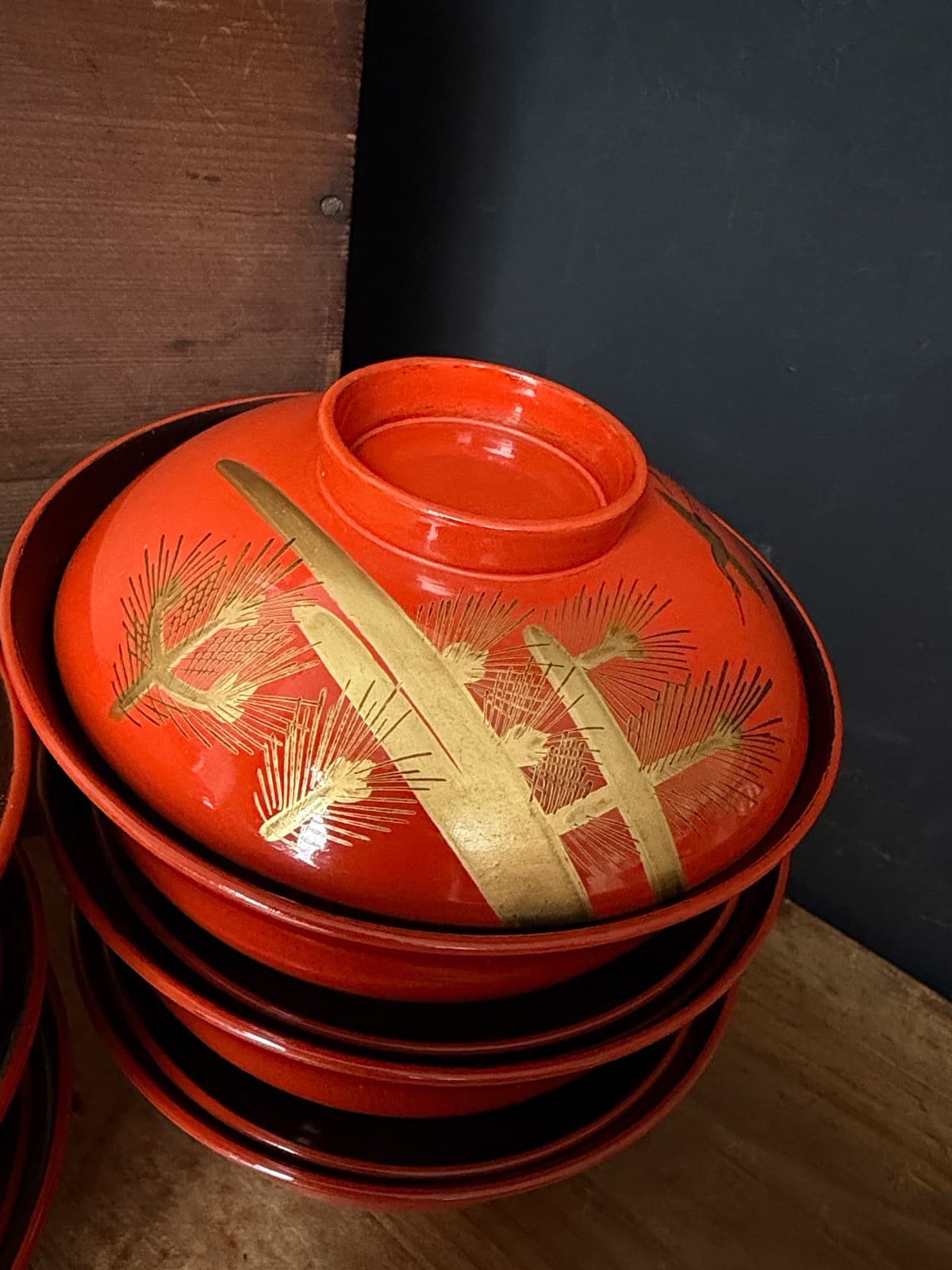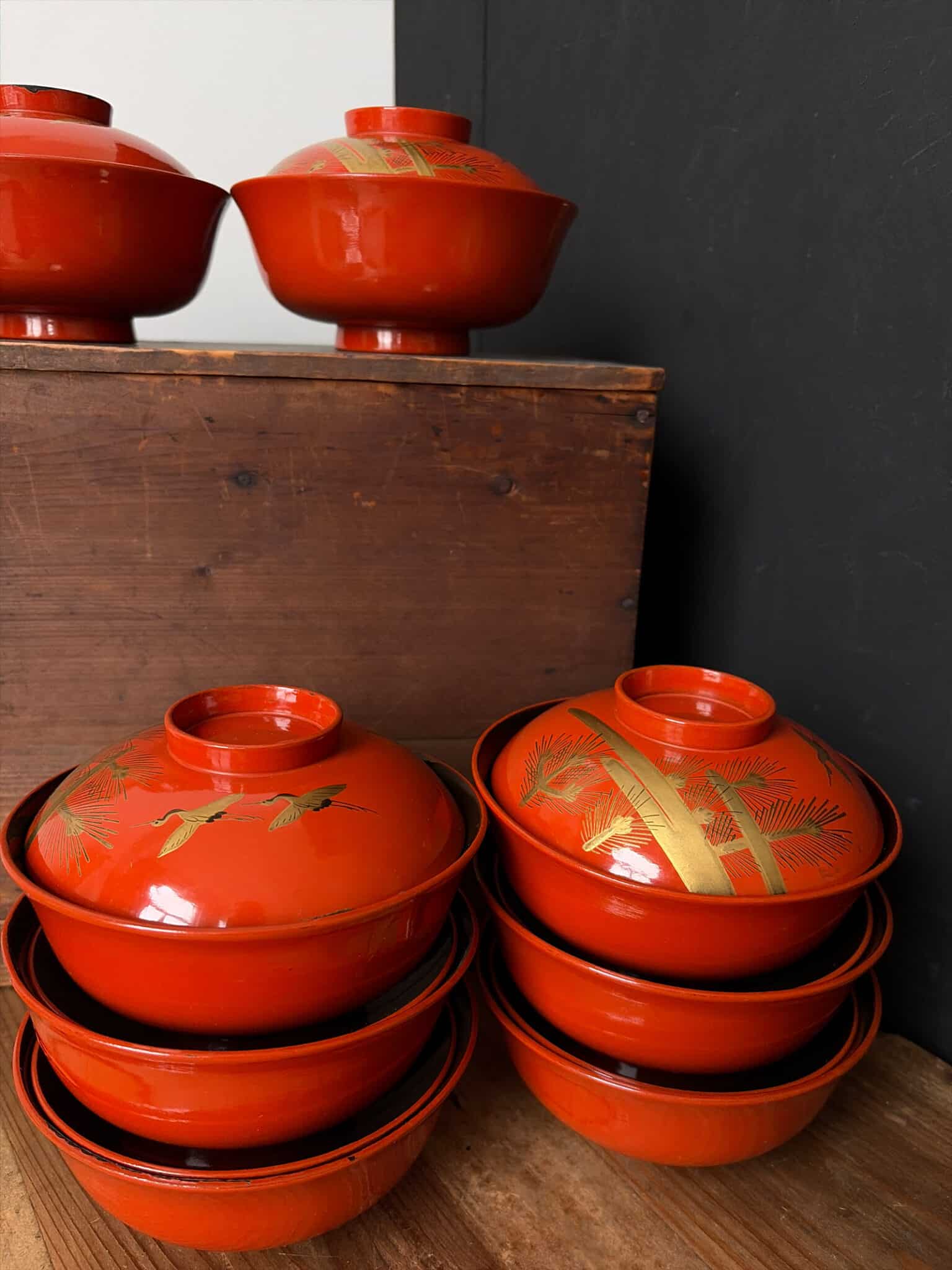 These 8 antique Urushi lacquerware bowls beautifully showcase traditional Japanese craftsmanship. Each bowl is handcrafted from lightweight wood and finished with multiple layers of natural Urushi lacquer, resulting in a vibrant red exterior and a contrasting dark brown interior.