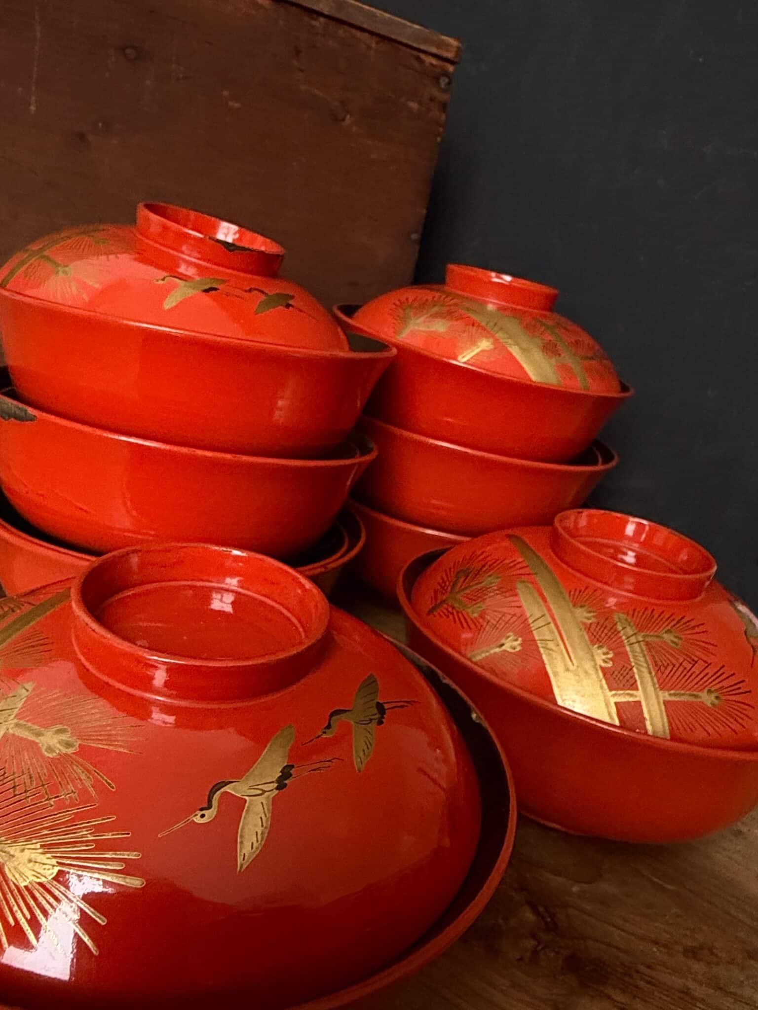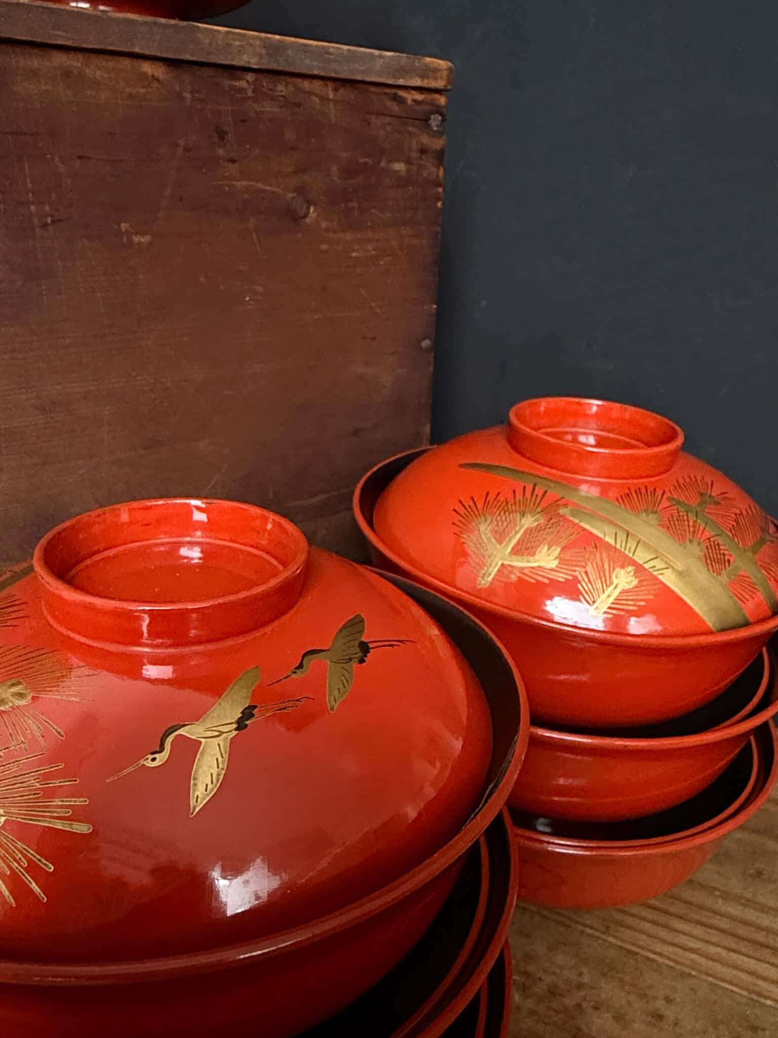 The lids are elegantly decorated with hand-painted flying cranes and pine trees in gold on the outside, with subtle branch details on the inside of the lids. In Japanese culture, cranes symbolize longevity and good fortune.