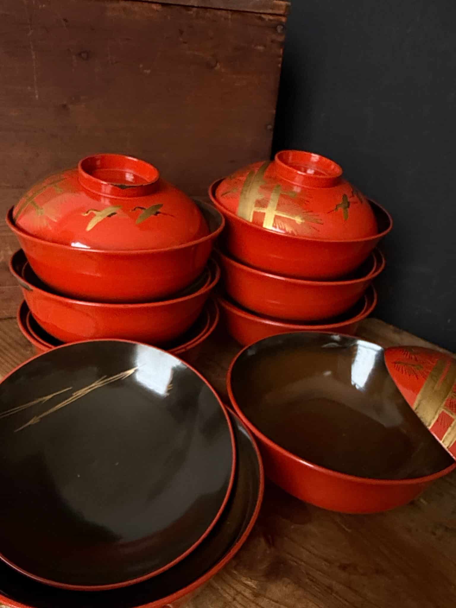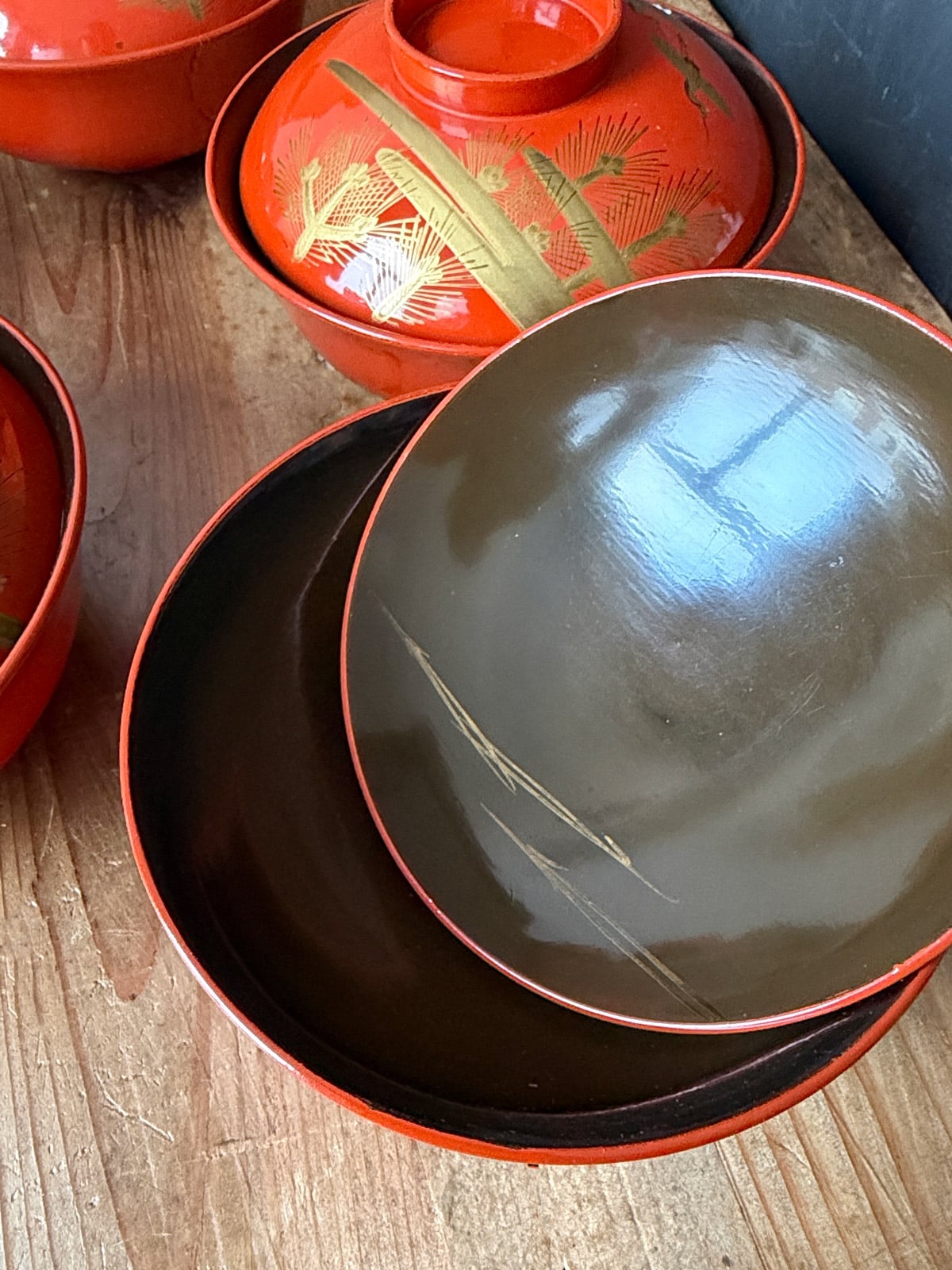 Antique red Urushi lacquerware bowls with gold hand-painted design