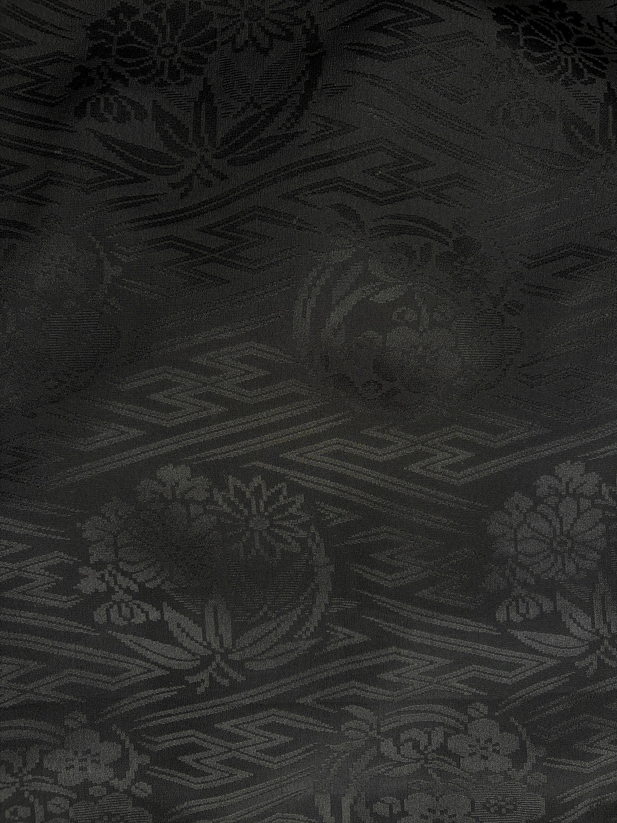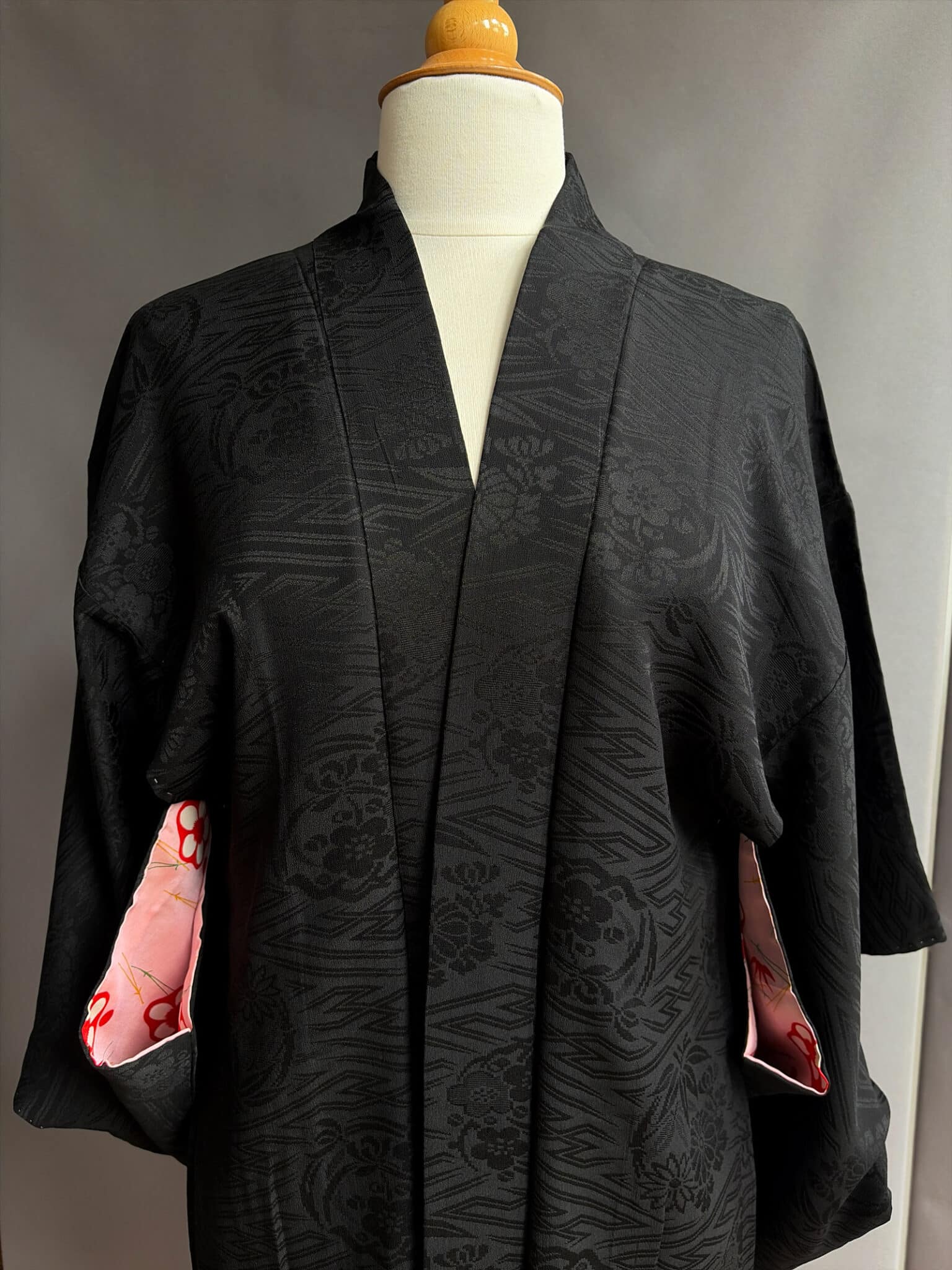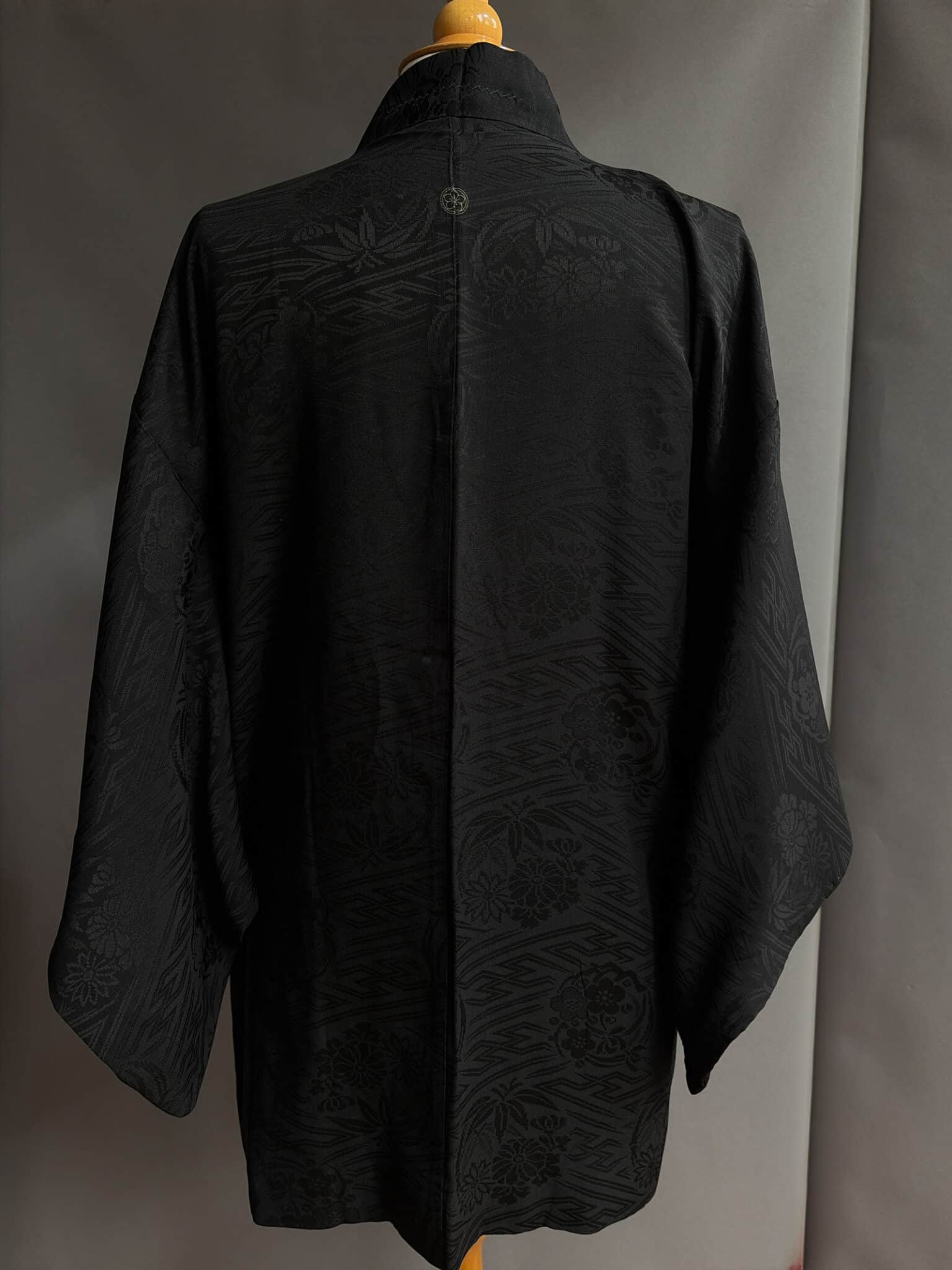 This beautiful antique black Haori dates from the 1930s. It’s hand-sewn from a soft silk with a subtle woven in Sayagata pattern combined with traditional floral motifs, the pattern reveals as the light hits the fabric. Sayagata is a traditional Japanese, geometric pattern of hooked crosses (Manji ) often connected by diagonal lines, it symbolizes dignity and longevity. And there’s a family crest (Kamon) stitched on the back.