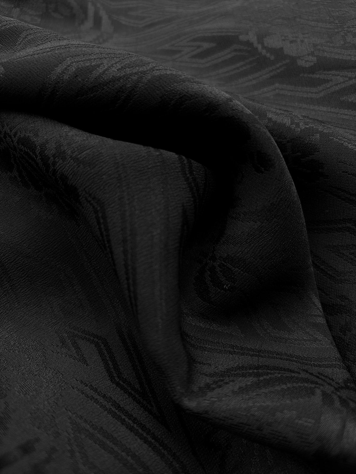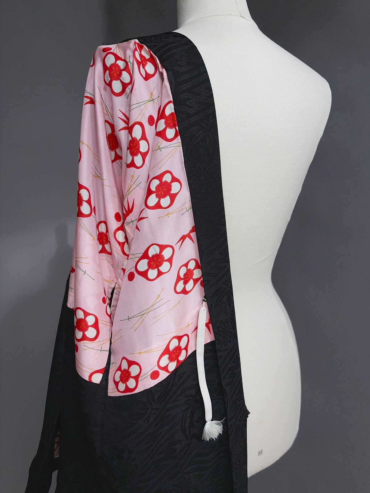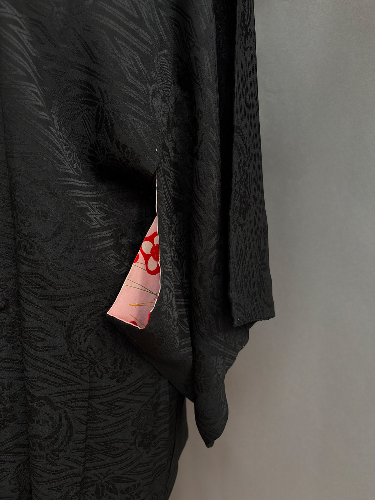 This beautiful antique black Haori dates from the 1930s. It’s hand-sewn from a soft silk with a subtle woven in Sayagata pattern combined with traditional floral motifs, the pattern reveals as the light hits the fabric. Sayagata is a traditional Japanese, geometric pattern of hooked crosses (Manji ) often connected by diagonal lines, it symbolizes dignity and longevity. And there’s a family crest (Kamon) stitched on the back.