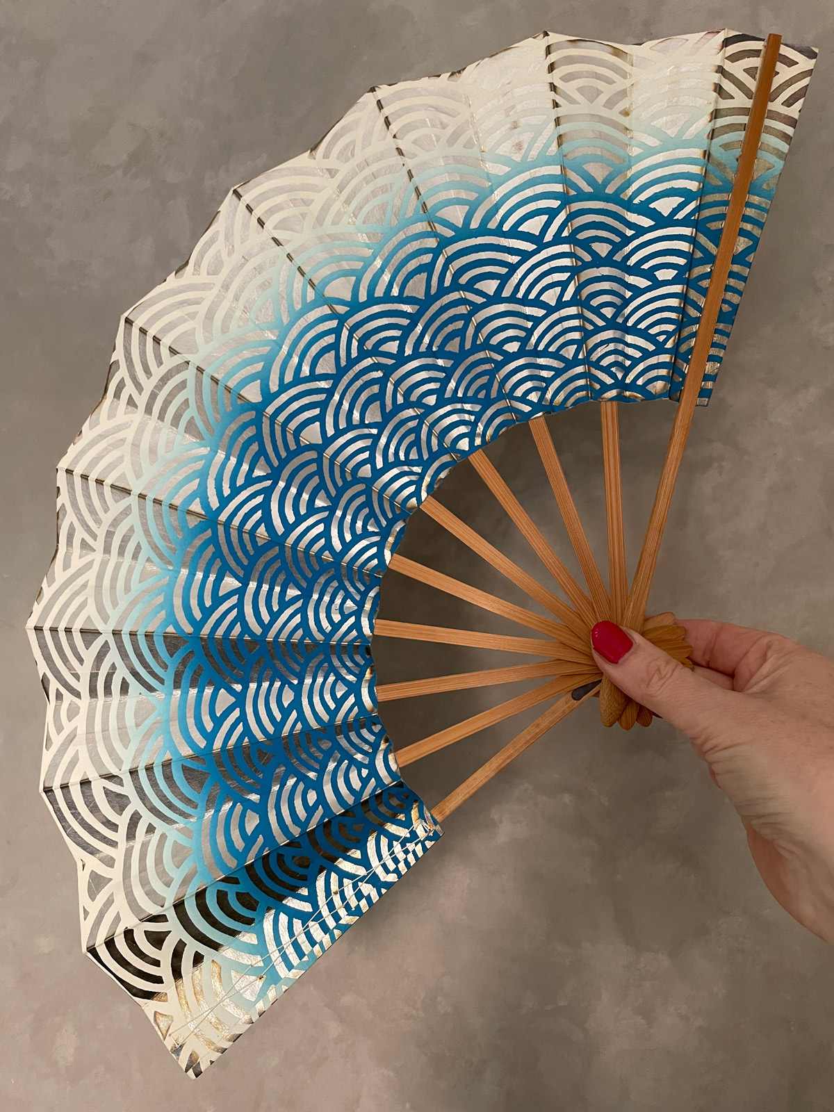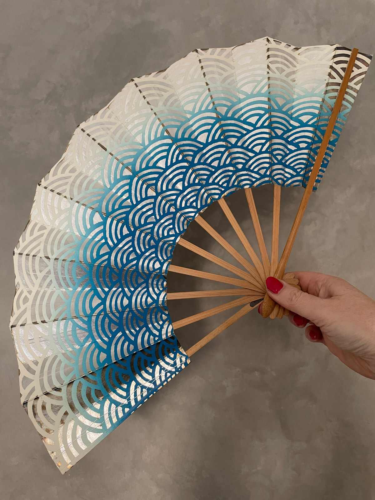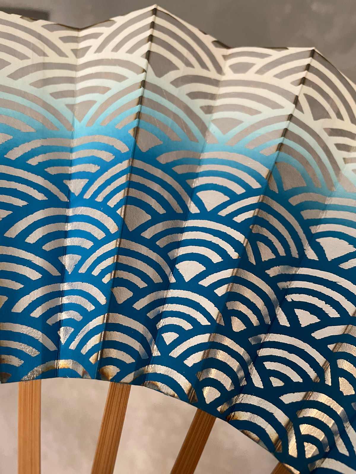 This vintage Japanese folding fan is made of sturdy paper stretched over bamboo ribs, it opens and closes with a firm flick of the hand. A Sensu Ogi folding fan is an important element in traditional Noh and Maiko dance performances, adding graceful visual movement on stage, also a practical use for cooling. It features a traditional Japanese waves pattern in gradient blue over a silver background. Used but in good vintage condition.