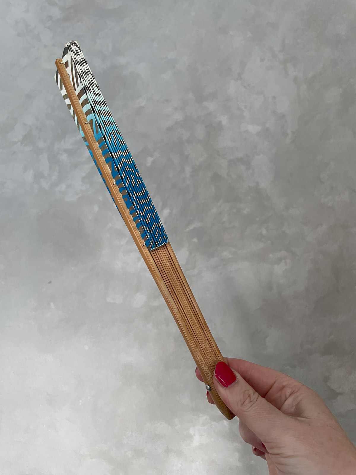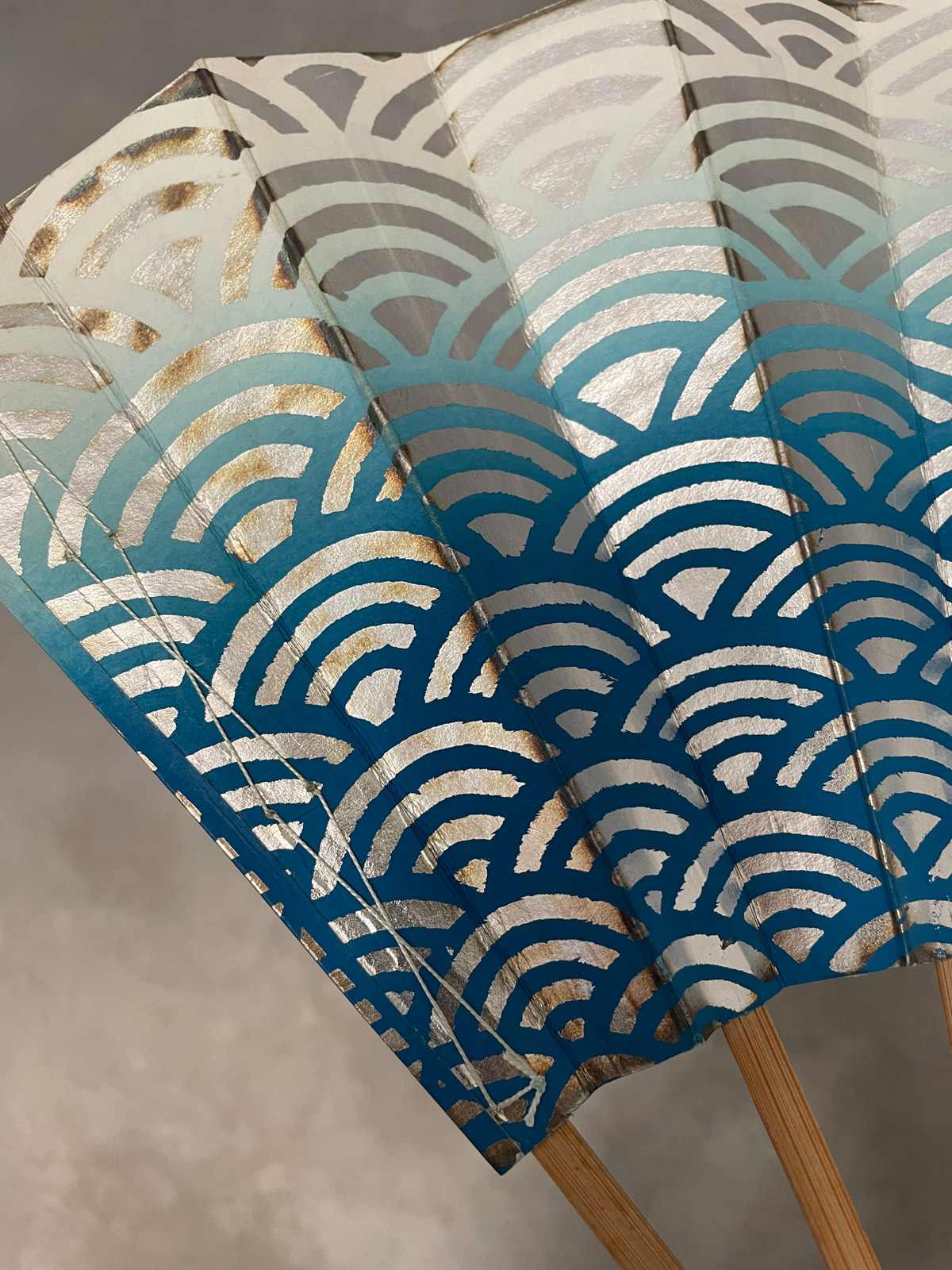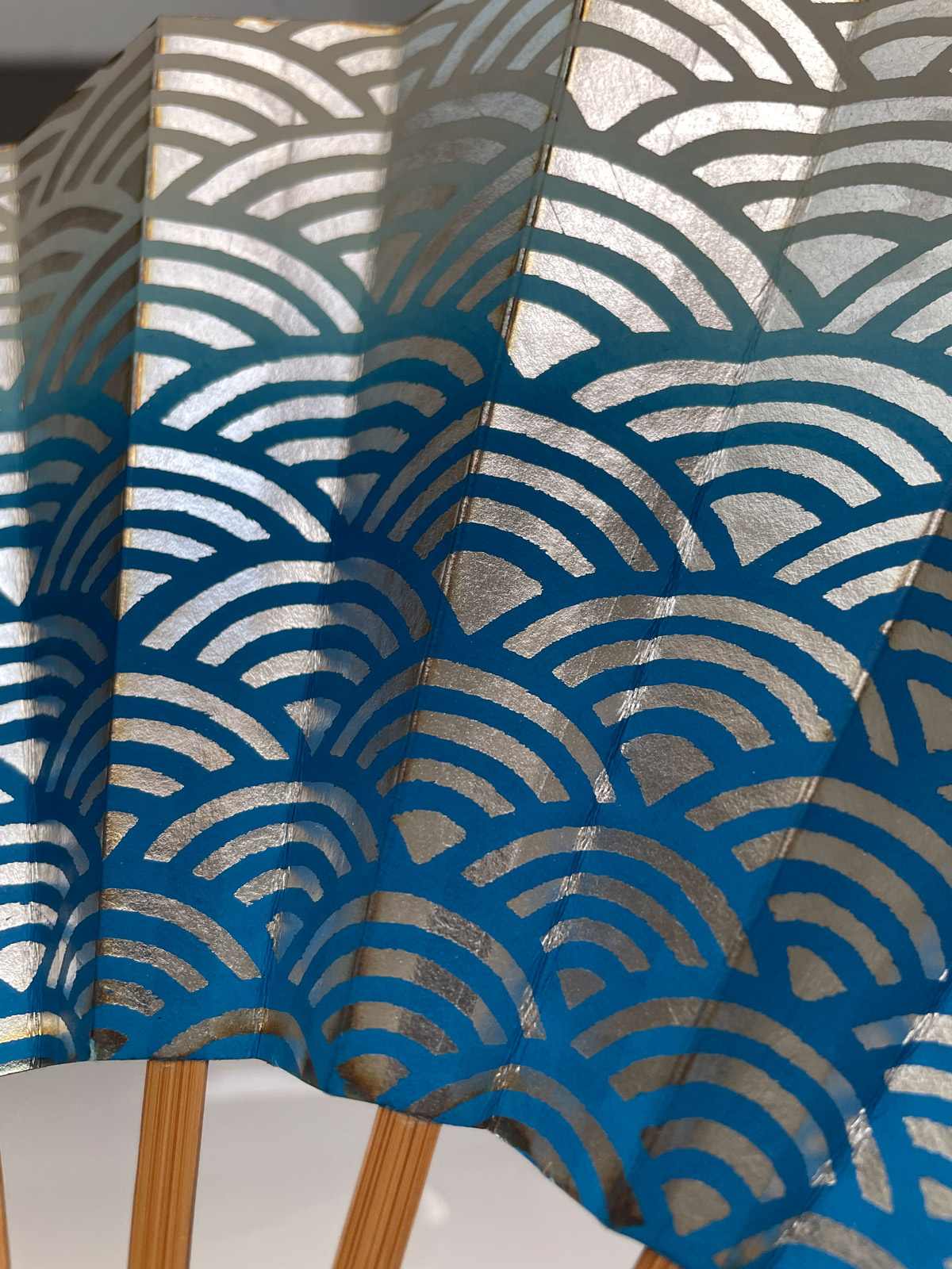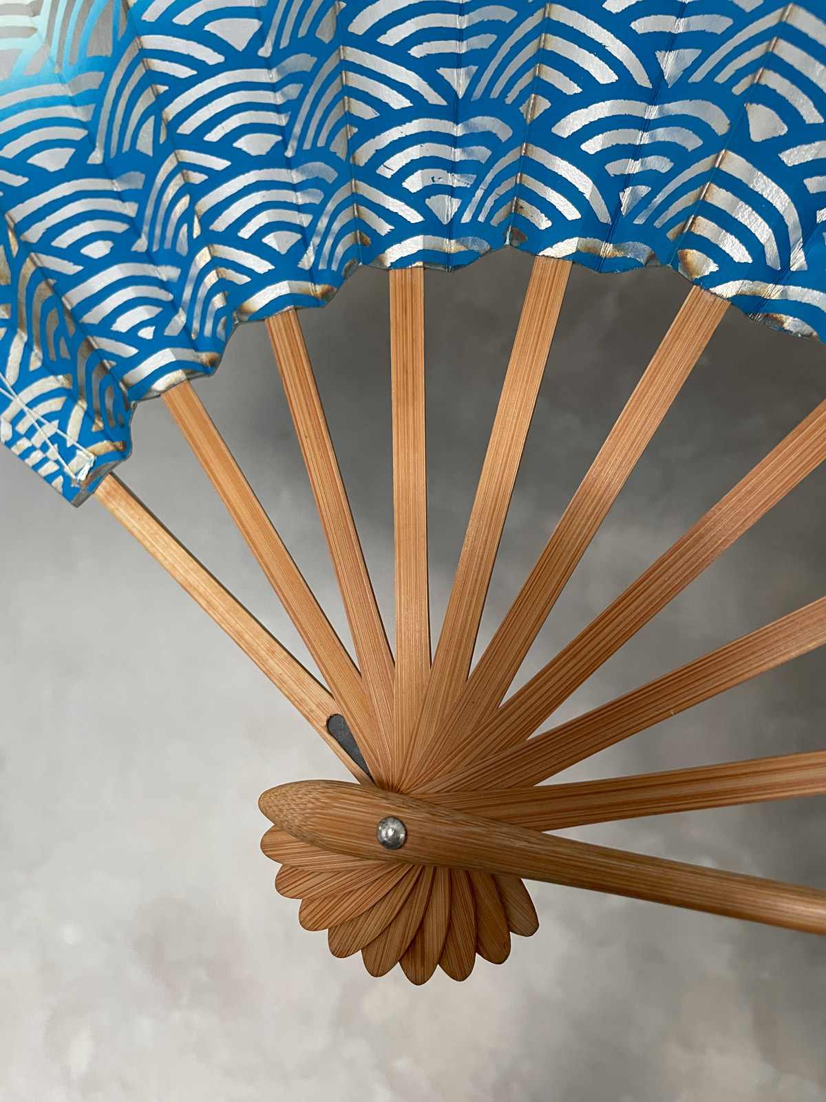 This vintage Japanese folding fan is made of sturdy paper stretched over bamboo ribs, it opens and closes with a firm flick of the hand. A Sensu Ogi folding fan is an important element in traditional Noh and Maiko dance performances, adding graceful visual movement on stage, also a practical use for cooling. It features a traditional Japanese waves pattern in gradient blue over a silver background. Used but in good vintage condition.