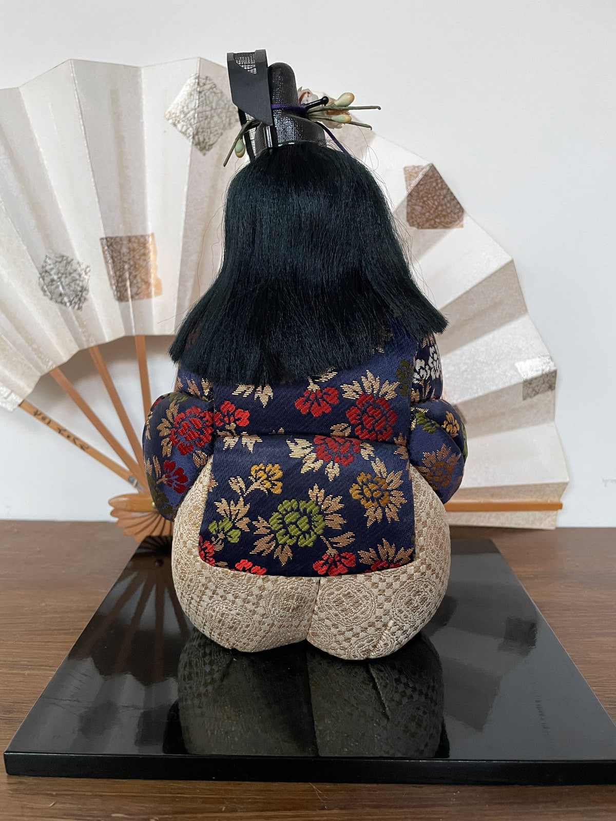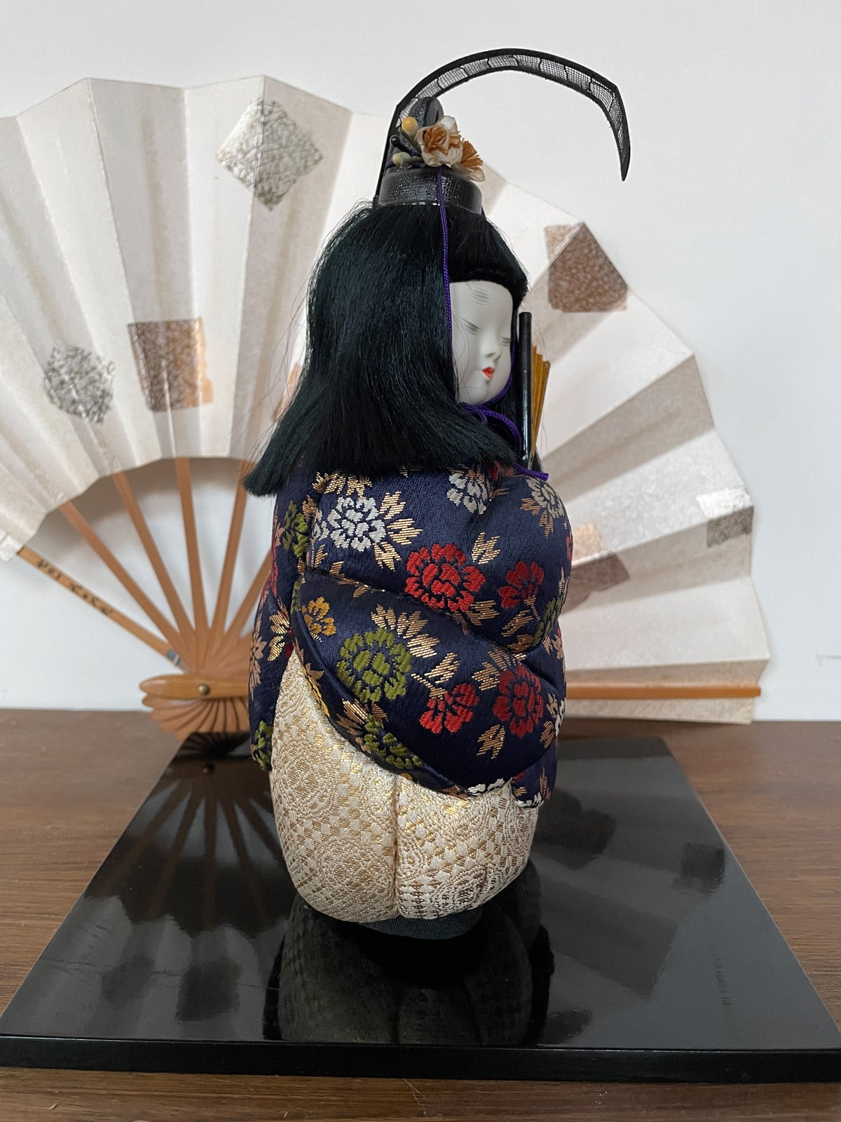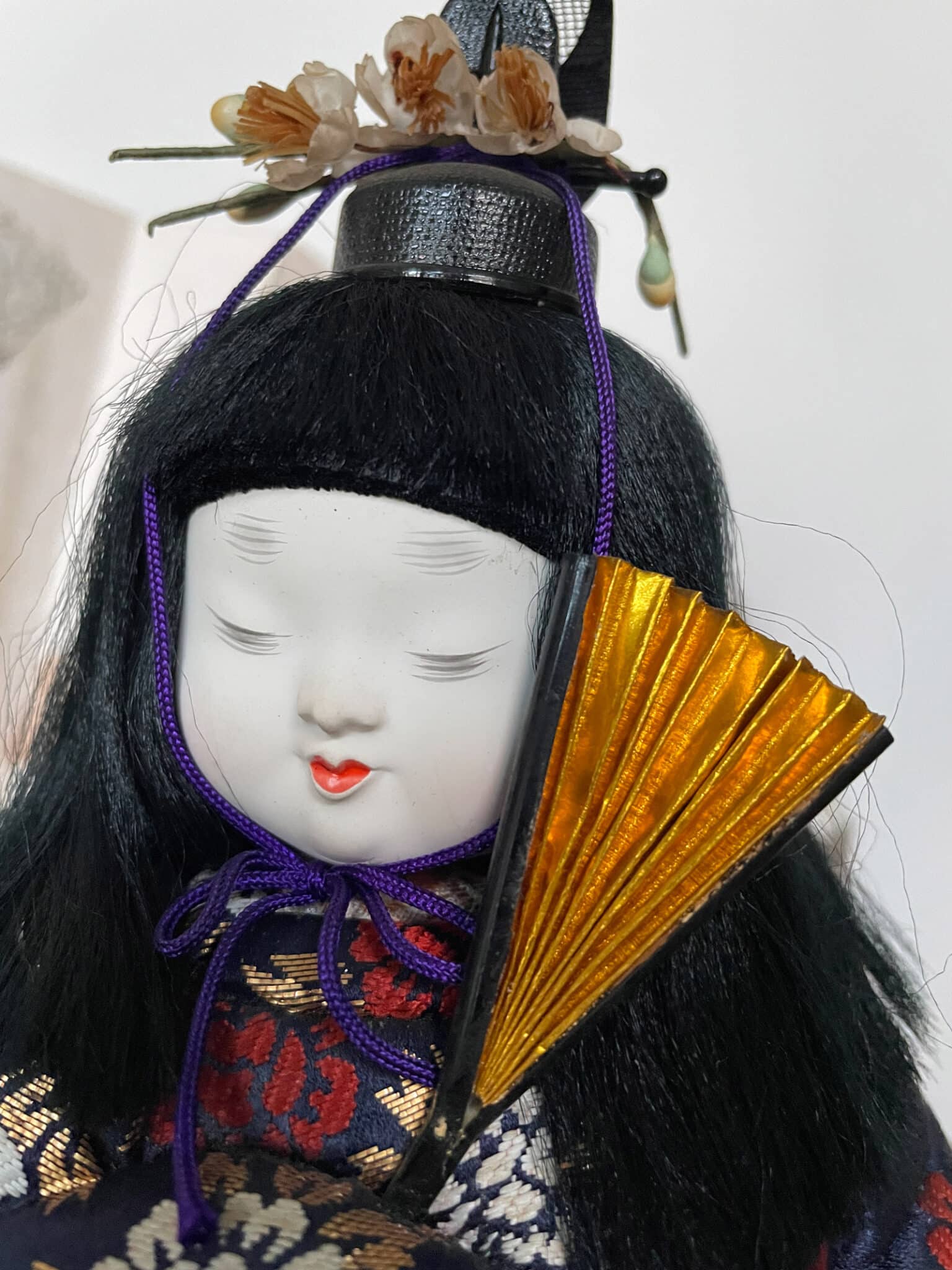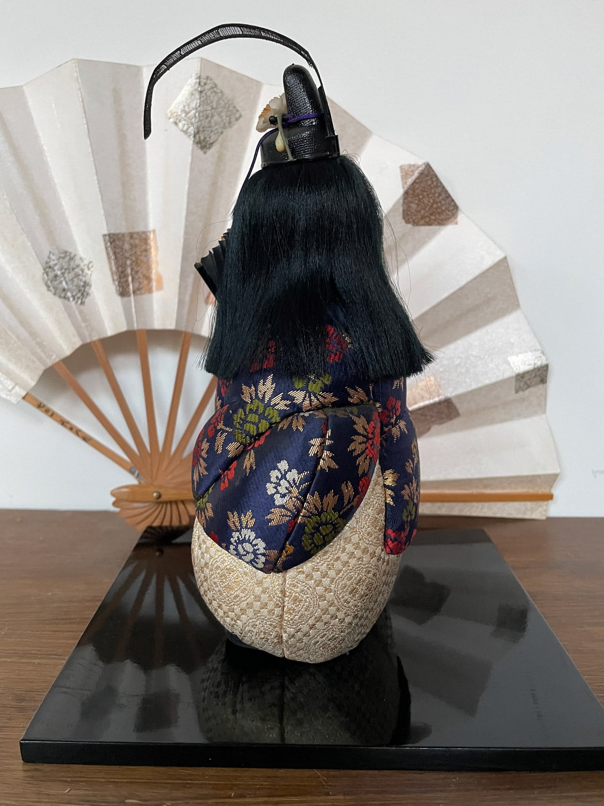 This large doll wears a kanmuri, a traditional ceremonial headpiece historically worn by Japanese nobles and samurai at the imperial court. Today, it is worn only by the imperial family and government officials. Dolls like this were traditionally displayed to wish children health, strength, and courage.