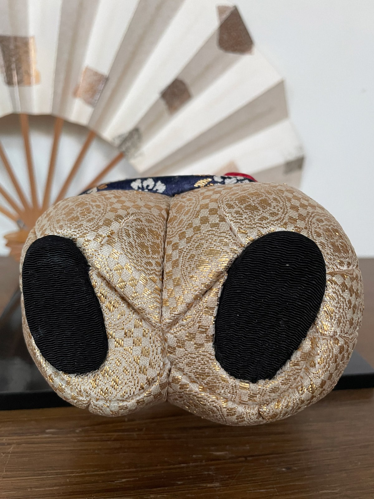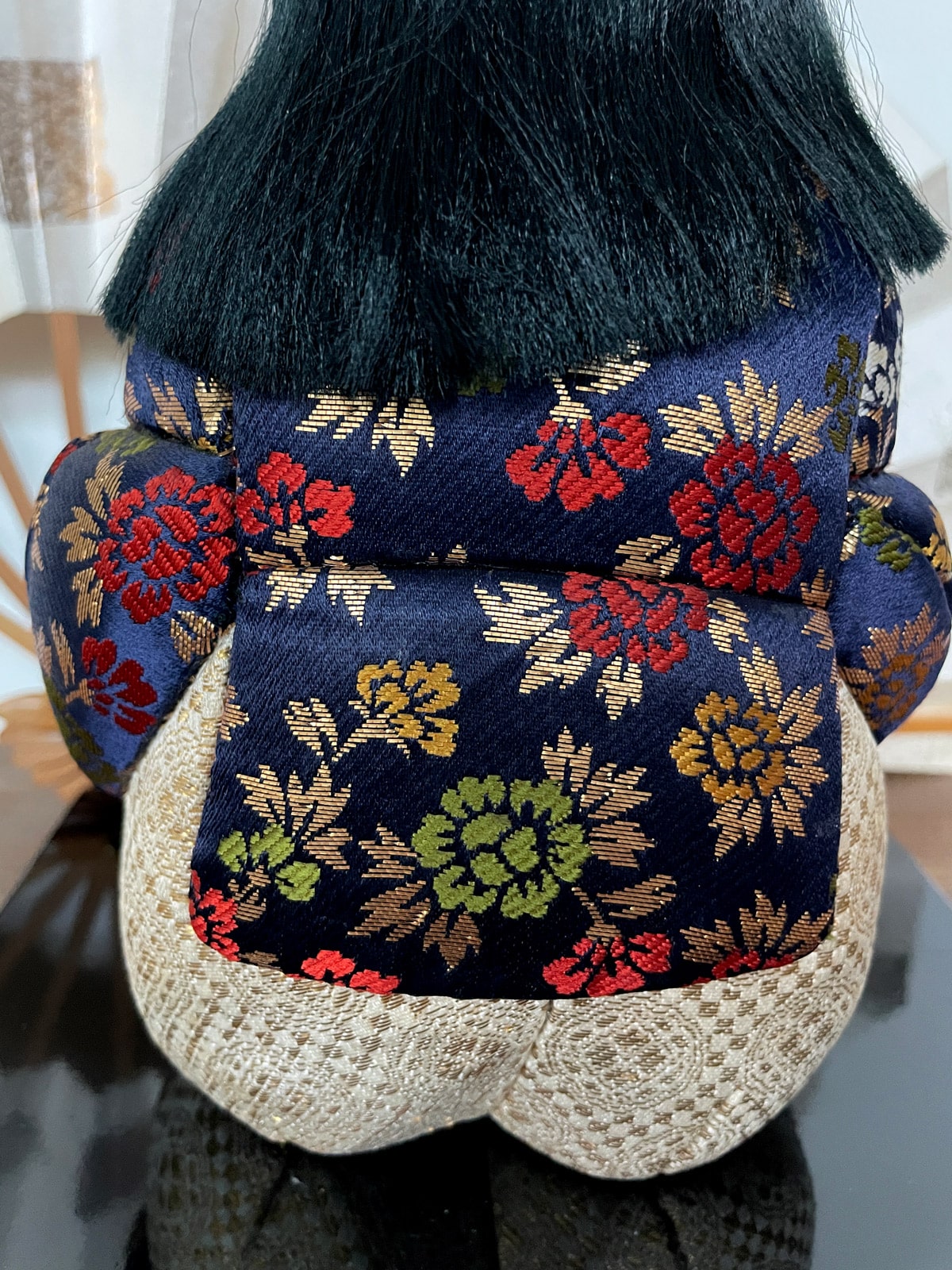The body of a Kimekomi doll is made of ‘toso‘, a paulownia wood sawdust mixed with wheat starch paste, after which it is artfully covered with various silk brocade fabrics. The head is made of bisque clay covered with a top layer of ‘gofun‘ (crashed oyster shell). Read more about this special Kimekomi technique on my About page.
